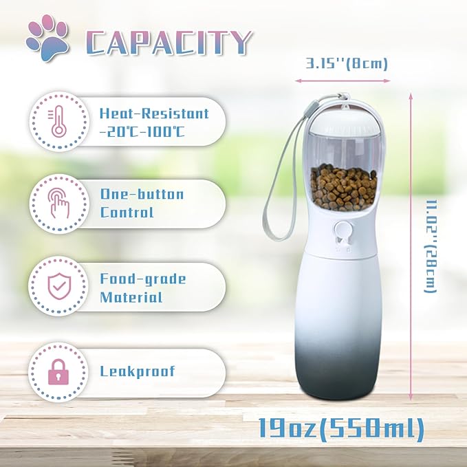 • 【2-in-1 Design】Our dog walking accessories combine a 19oz large capacity pet water bottle with an extra pet food container, ensuring your furry friend has both food and drink covered during outdoor walks, hikes, camping, and travel. The unique color design makes our pet water bottles the perfect dog gifts for birthday or any occassions.