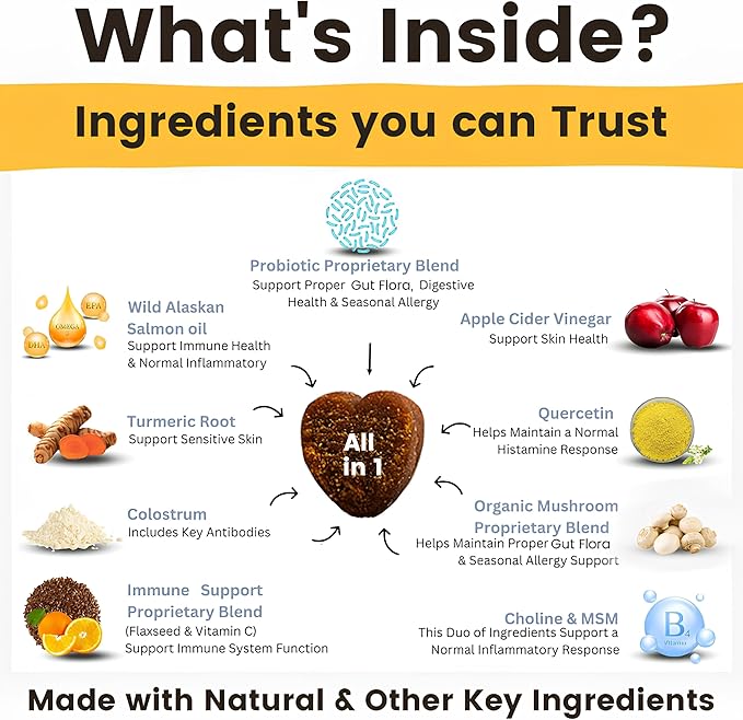 • SUPERIOR FORMULA: Every ingredient in these anti itch for dogs chews is carefully researched, sourced, and combined for optimal canine wellness. Colostrum nurtures gut flora and fortifies immunity, acting as a protective shield. Turmeric soothes dog skin and maintains joint flexibility. Wild Alaskan Salmon oil, rich in Omega 3s, enhances skin's natural glow. Organic Mushroom blend promotes immunity, while our Probiotic blend helps with efficient digestion and eases seasonal discomfort.