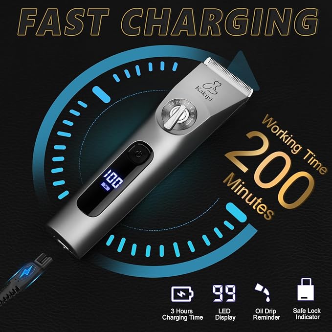 • Long Battery Life with LED Display: The cordless rechargeable pet razor is equipped with a 2000mA high capacity lithium-ion battery, only 3 hours to fully charge and can provide more than 200 minutes of operating time, and with the LCD display, you can see the remaining power at a glance.