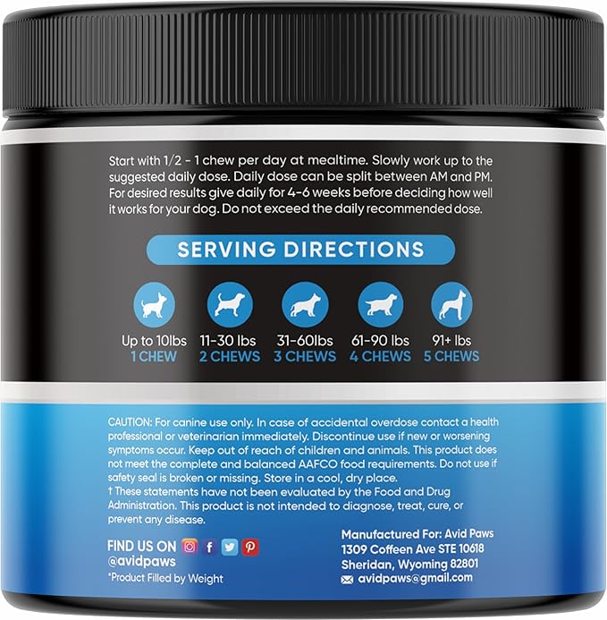 • Made in the USA: Our chewables are proudly made in the USA using high-quality US and imported ingredients following rigorous standards. You can trust the quality and safety of our product for your beloved canine companion.