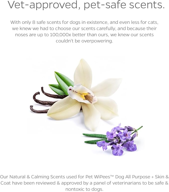 • VET-APPROVED, PET-SAFE SCENTS: When there are only 8 scents in the world that are safe for dogs, and even less for cats, we knew we had to have the safest scents that furbabies wouldn't turn their nose up at. Our scents have been reviewed and approved by a panel of veterinarians to be safe, nontoxic, and non-irritating for both dogs and cats. Just enough in our formulas to smell good, the scents in these paw wipes for dogs are not enough to upset sensitive sniffers.