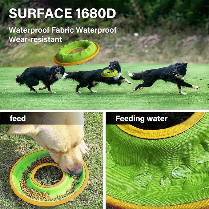 • New Groove Design: Dog discs outer layer is made of waterproof nylon woven fabric sewn by hand. The inner lining is made of 4mm EVA bite-resistant soft material as the main body, and it does not hurt the dog teeth. The outermost ring has a built-in transparent hose to increase the bite resistance. The new dog disc is designed with grooves so that it can be used not only as a flyer toys, but also as a feeder. ips: This is not a chew toy! But the ball is.