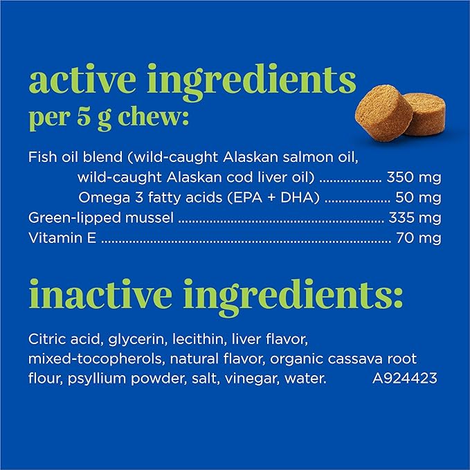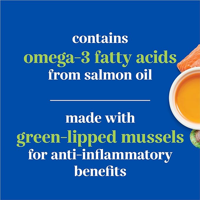 • Dog joint supplement containing omega-3 fatty acids from salmon oil to help ease joint stiffness due to normal daily exercise and activity