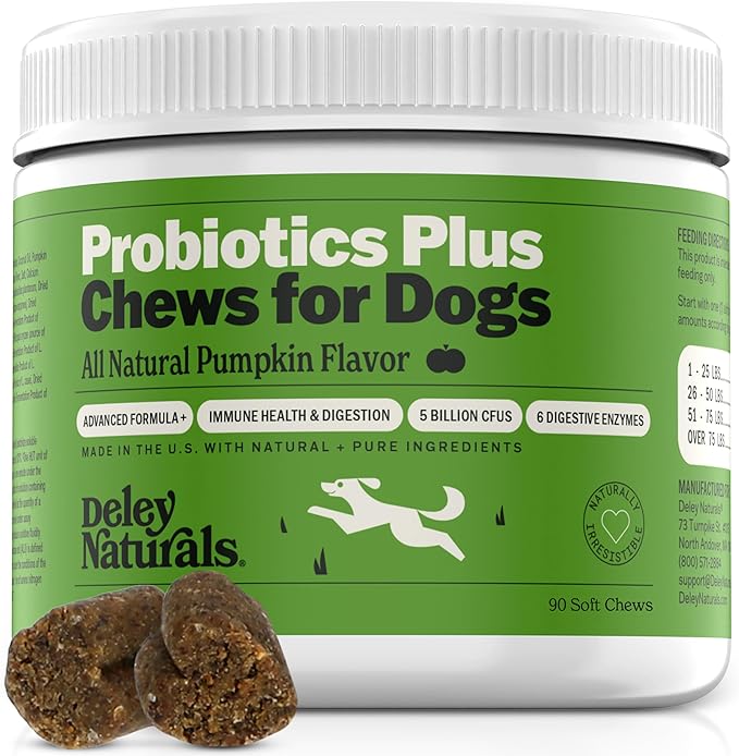 Deley Naturals Probiotics Plus Chews for Dogs, Gut Health Supplement, 5 Billion CFU's, Digestive Enzymes, Prebiotics, Dog Allergies, Diarrhea, Yeast, Pumpkin Flavor, 90 Count - Made in The USA