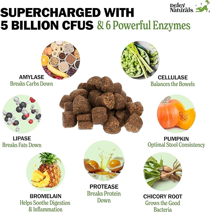 • DOG GUT HEALTH PROBIOTICS: Deley Naturals Probiotic Plus for Dogs improves gut health, irritable bowels, gas, bloating and constipation, loose stools, and anal gland issues. These soft chews can help skin and coat problems, allergies, itching, bad dog breath, which are caused by a lack of good gut health.