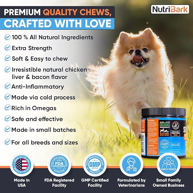 • ALL NATURAL & SAFE : Made for all breeds & sizes, our dog joint supplement is made exclusively from Premium Quality NATURAL INGREDIENTS and contains ZERO grains, soy, wheat, corn, preservatives, artificial colors or flavors. NON-GMO Made right here in the USA in an FDA registered facility.