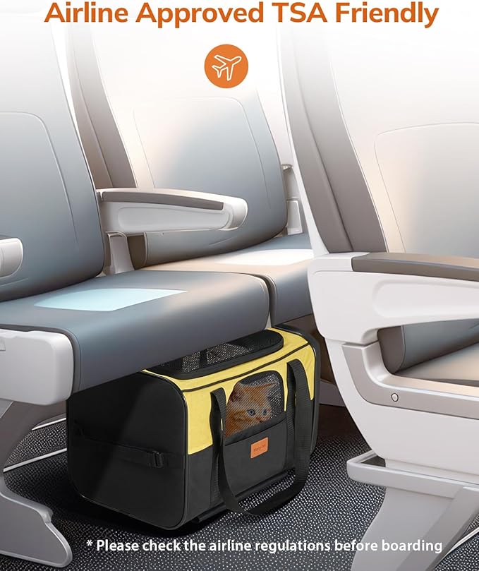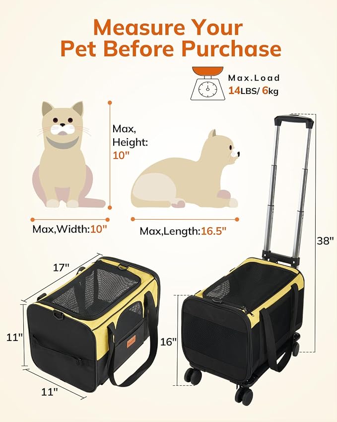 • 【 Pet Carrier Airline Approved 】Our pet carrier with wheels meets major airlines' standards, fitting easily under front cabin seats once wheels or the bottom panel are removed (please confirm with the airline beforehand). This cat carrier easuring 17" long x 11" wide x 11" high, it comfortably accommodates pets up to 14lbs – refer to length and height for a perfect fit.