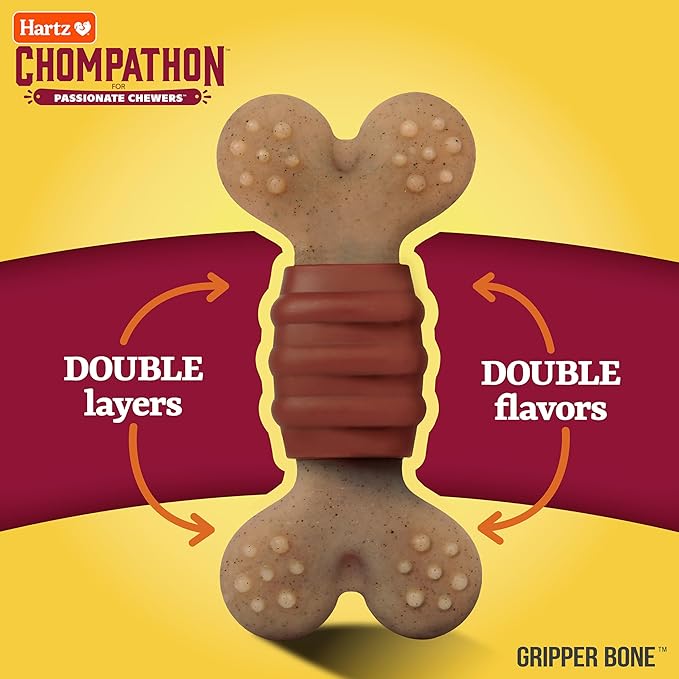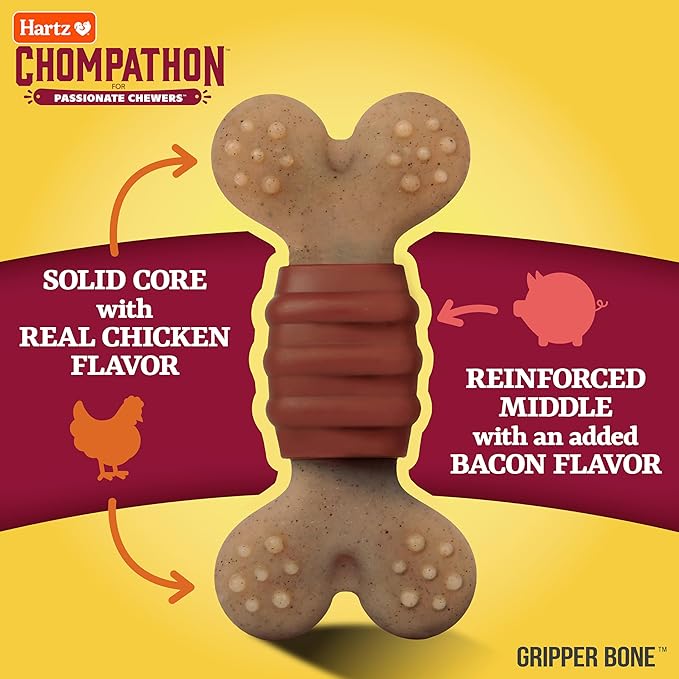 Hartz New Chompathon Gripper Bone Dog Chew Toy for Aggressive Chewers, Double Layered Flavored with Chicken & Bacon