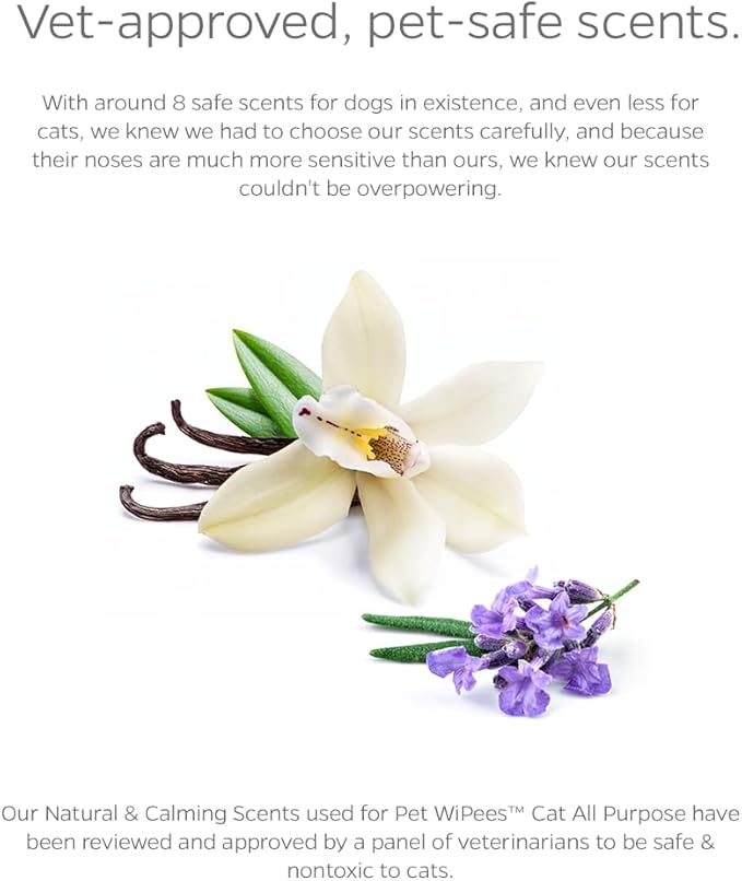 • VET-APPROVED, PET-SAFE SCENTS: When there are only 8 scents in the world that are safe for dogs, and even less for cats, we knew we had to have the safest scents that furbabies wouldn't turn their nose up at. Our scents have been reviewed and approved by a panel of veterinarians to be safe, nontoxic, and non-irritating for both dogs and cats. Just enough in our formulas to smell good, the scents in these cat pet wipes are not enough to upset sensitive sniffers.