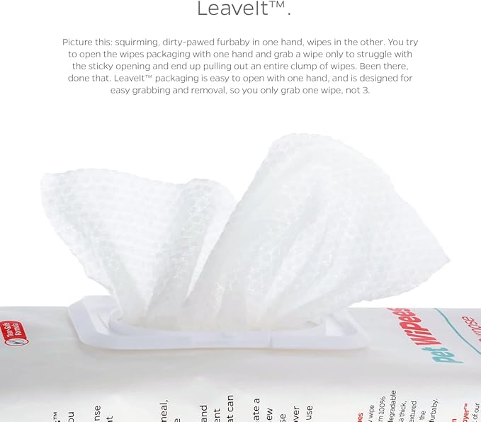 • INTENTIONAL PACKAGING: With a wiggly furbaby in one hand, the last thing you need is hard to open dog wet wipes that clump when you pull them out. Pet WiPees innovative LeaveIt packaging prevents clumping, so you only pull one, not three dog paw wipes. These pet grooming wipes feature a resealable lid, preventing the large dog wipes from drying out, and making for easy one-handed use. For when your furbaby didn't have 'getting a bath' on their agenda, Pet WiPees help make it easy.