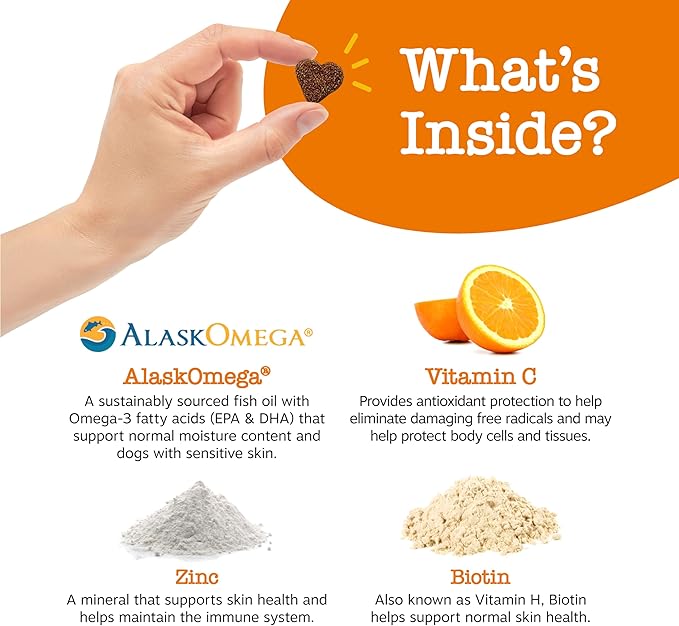 • With AlaskOmega Fish Oil – Want to avoid dry and itchy skin? These soft chews include a premium fish oil for dogs with Omega-3 fatty acids(EPA & DHA) to support skin health and normal moisture.