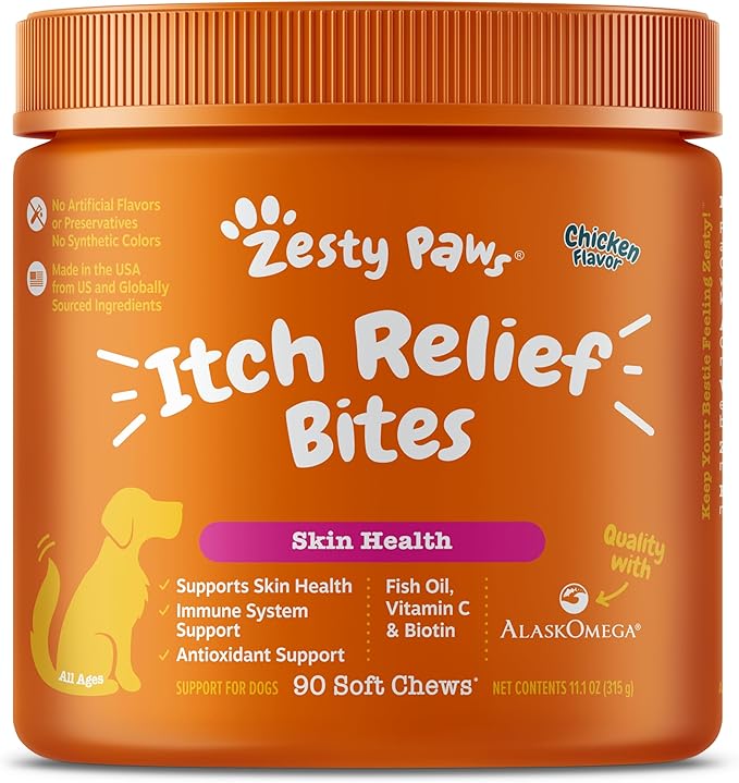 Zesty Paws Itch Relief for Dogs - for Itching Skin & Coat Health - Omega-3 Fish Oil with EPA & DHA - Dog Bites Supplement with Vitamin C & E for Antioxidant Support - Chicken Flavor - 90 Count