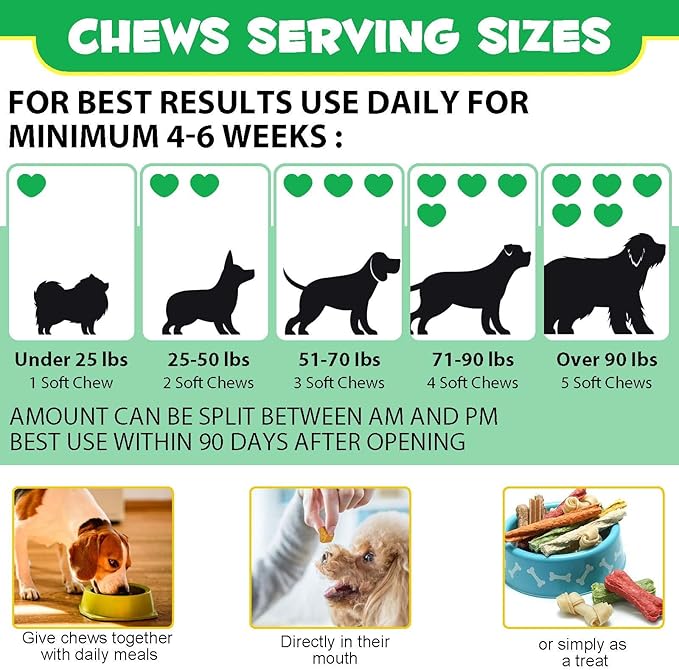 • ✔️SUITABLE FOR ALL BREEDS AND AGES: Dog probiotic chews is a veterinary formulated supplement that is safe and healthy, easy to digest and highly absorbable. Suitable for all pets of any size and age. Dogs weighing less than 25 pounds should eat 1 soft chew per day; 25-50 pounds should eat 2; 51-70 pounds should eat 3; and 71-90 pounds should eat 4. Over 90 lbs Eat 5 soft chews per day, try our probiotic chews for dogs for 30 days and get a 100% refund if you don't see any changes in your dog.