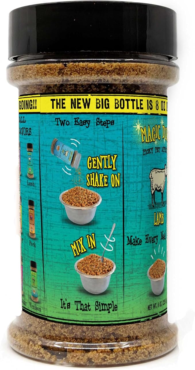 • Lamb Magic Dust: Give your dog or cat the flavor they crave with our Lamb Magic Dust. With minimal ingredients and a delicious lamb flavor, this simple solution breathes new life into mealtime. Available in 3.5 ounce and 8 ounce bottles to suit your needs.