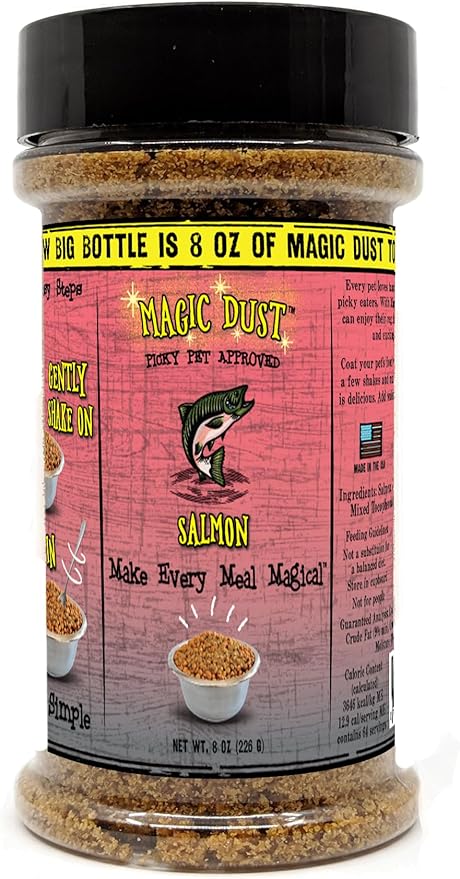 • Salmon Magic Dust: Give your dog or cat the flavor they crave with our Salmon Magic Dust. With minimal ingredients and a delicious salmon flavor, this simple solution breathes new life into mealtime. Available in 3.5 ounce and 8 ounce bottles to suit your needs.