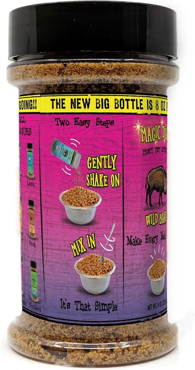 • Wild Boar Magic Dust: Give your dog or cat the flavor they crave with our Wild Boar Magic Dust. With minimal ingredients and a delicious wild boar flavor, this simple solution breathes new life into mealtime. Available in 3.5 ounce and 8 ounce bottles to suit your needs.