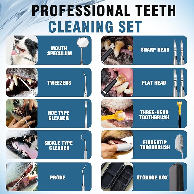 • FINGER TOOTHBRUSH AND DENTAL TOOL KIT:The dog dental cleaning kit comes with a finger toothbrush, 3 head pet toothbrush and dental stainless steel tool 6 packs set for easy all-around cleaning of your cat's and dog's teeth.The 6 packs stainless steel dental tool kits will get rid of tartar and plaque your pet's mouth misses in one go. The dental oral mirror allows you to see every inch of your pet's mouth. The storage box helps you organize and store the tooth brushing kit to avoid losing it.
