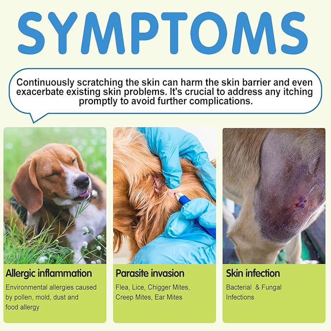 • Delicious Peking Duck Flavor And Suitable for All Breeds: The itchy skin treats come in the shape of soft naturally Peking Duck chews, with natural chicken taste, ideal even for the pickiest eaters!Our allergy treats for dogs are suitable for all breeds, sizes, and ages, from puppies to older dogs. Recommended for daily use. Our goal is to help dogs live a happier and healthier lifestyle by supporting optimal nutrition through natural dog supplements, If there is any problem, welcome to return