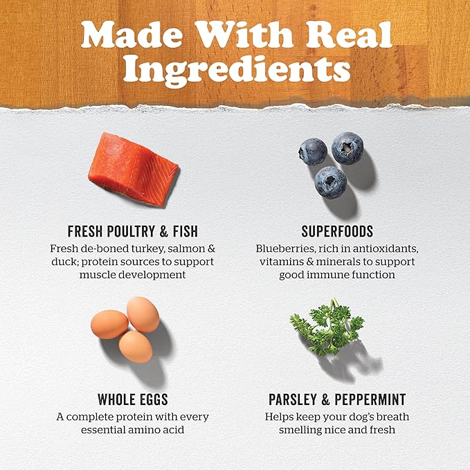 • REAL MEAT & FISH: Grain free dog food recipe made with only fresh de-boned meats & fish for protein, omega 3s & 6s, and a delicious taste. Includes premium-quality turkey as the first ingredient plus fresh salmon & duck. No by-product or meat meals.