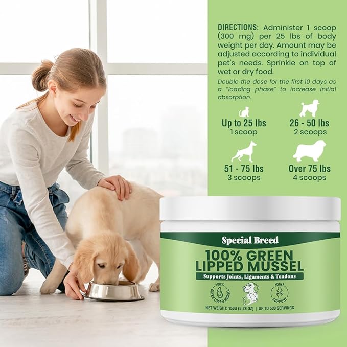 Green Lipped Mussels for Dogs & Cats - Premium Joint Supplement Powder for HIPS, Joints, and Muscles (150 Grams, Up to 500 Servings)