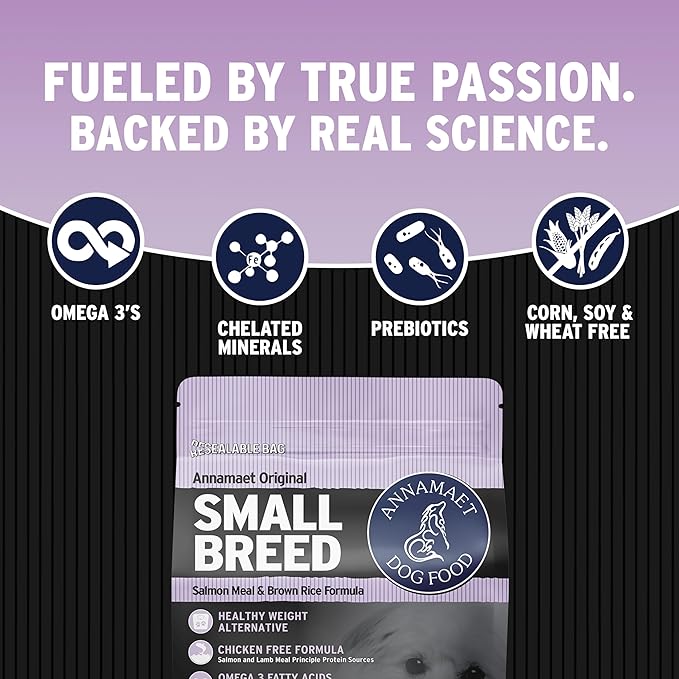 • Annamaet Small Breed Salmon is fit to feed your dog from their puppy years all the way through their adult and senior years, Small breeds need a more nutrient dense food as they eat smaller amounts per day