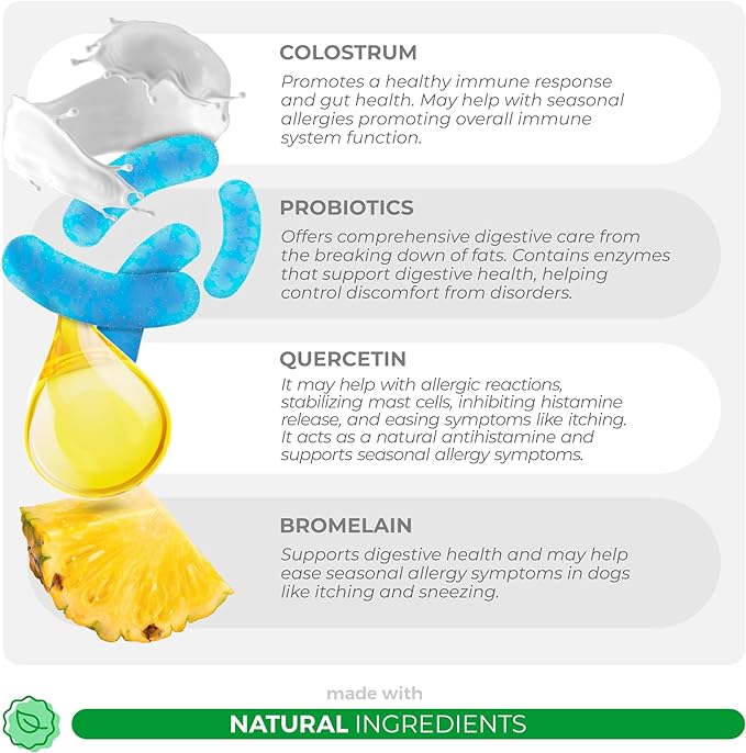 • Allergy Support for Dogs - Our dog allergy chews use the best natural ingredients to address internal and external symptoms to relieve most allergy symptoms that may affect your dog.