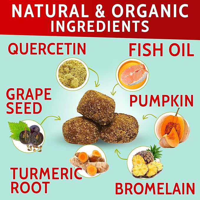 • MADE IN THE USA. HEALTHY AND SAFE- these allergy relief chews are made in the USA, with USA grown and processed ingredient. Treats contain absolutely NO sugar, dairy, corn or soy-derived products, no hormones, no artificial flavoring or preservative.