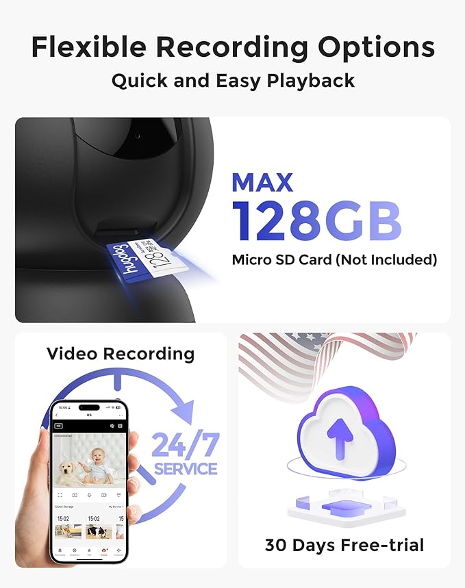 • [Us Cloud Storage & Sd Card Storage]The indoor Security Cameras Support Cloud Storage And A Built-In Micro-Sd Slot. The Server Is Located In The Us. Recording To The Encrypted Cloud Server Helps To Avoid The Risk Of Losing Video Clips, And Ensure All Your Videos Are Safe And Protected. The Home Security Support Micro Sd Card Up To 128Gb, To Store High Quality 2K Day And Night Color Footage Locally In The Camera.