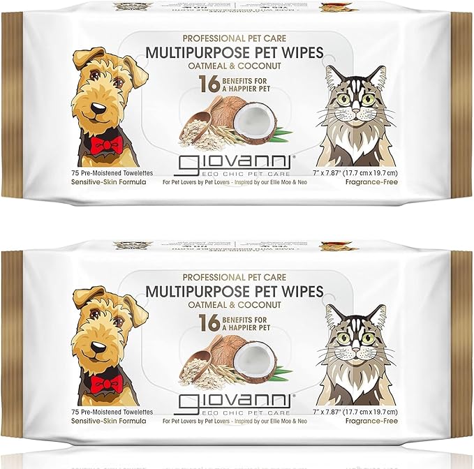 GIOVANNI Multipurpose Pet Wipes, Pack of 75 – Oatmeal & Coconut Helps Neutralizes Odors (Pack of 2)