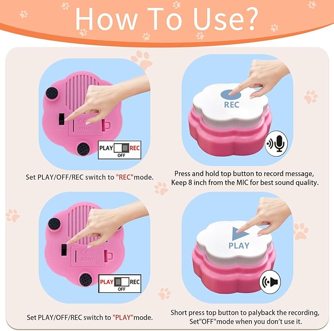 • 🐾【Pet Training Button 】Talking buttons record commands such as 'TREED', 'WATER', 'OUTSIDE', 'PLAY', 'MOM' ETC. Let your pet communicate with you; with a little patience, you can get inside your pet's head. Dog button set is suitable for all kinds of small dogs, medium dogs, large dogs and more.