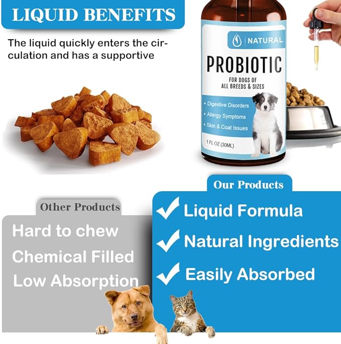 • LIQUID BENEFITS: Many probiotics on the market are tablets, capsules, or chews. These can be hard on your pets stomach, and do not absorb very well. Our liquid probiotics drops offer the highest absorption possible, and come in an easy to digest form - the liquid quickly enters the circulation and has a supportive effect.