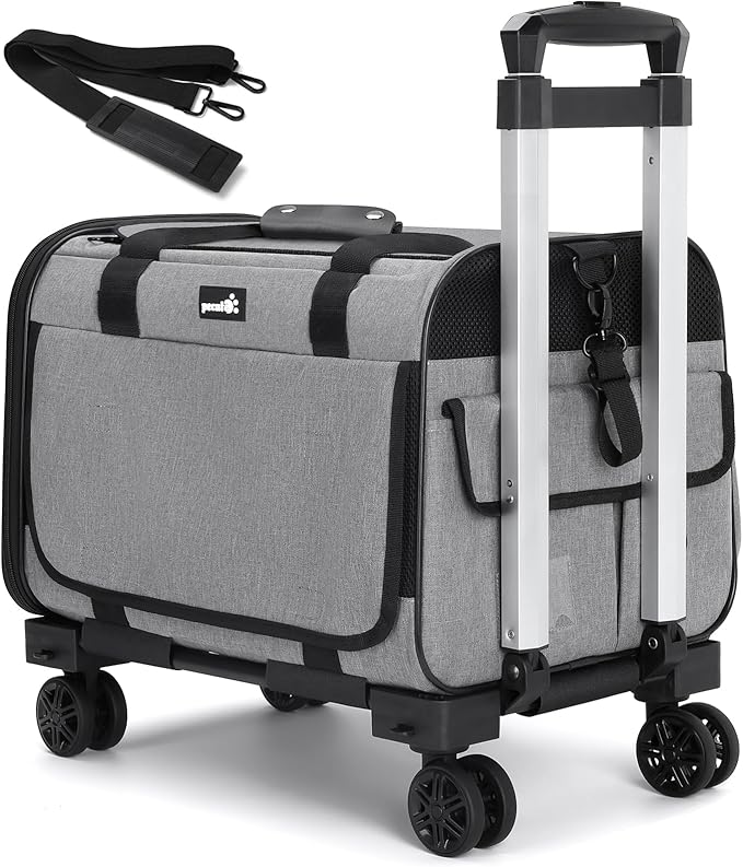 • 🐾 【Easy Journey】This Rolling Pet Carrier has a collapsible double-rod handle and an independent metal base. It also comes with 2 detachable nylon silent wheels that can rotate 360 degrees and 2 fixed wheels. It surpasses other cat carriers in durability, stability, and maximum safety for your pet, providing a smooth riding experience.