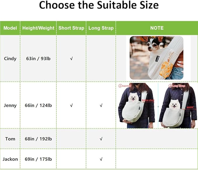 • Comfortable Extended Strap: The strap is 39.4 inches. Suggest the customer's height is more than 5.4FT can chose. Wide shoulder strap makes sure the pet safety and user experience. It spreads the weight over your shoulder, minimizes the sore pain to carry pets.The shoulder strap of this style is not adjustable.