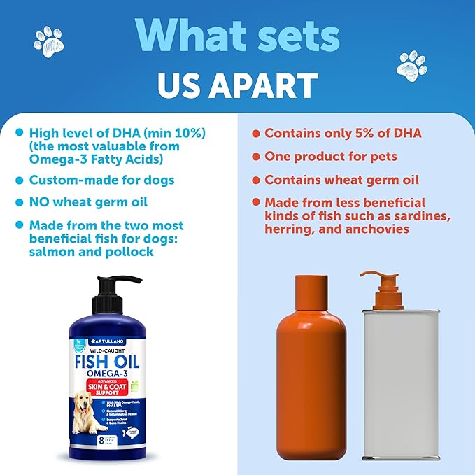 • Skin & Coat Support: Elevate your dog's coat defense with a specialized pet liquid fish oil designed to optimize skin health, resulting in a glossy, resilient coat that's both healthy and vibrant