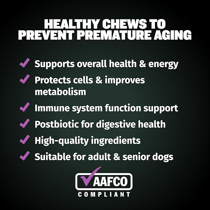 • ANTIOXIDANT-RICH DOG VITAMINS: As part of a daily dog food regimen, Bully Max's senior dog vitamins combat premature aging. Featuring Acai Berry Fruit Powder and Goji Extract, these chews are loaded with potent antioxidants to fight free radicals, preserving your dog's youthful energy and vitality. These senior dog supplements support a healthier, more active lifestyle, ensuring your aging pet thrives with each serving.