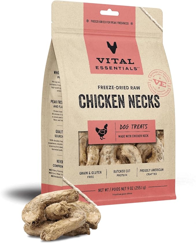 • FREEZE-DRIED RAW CHICKEN NECK DOG TREATS: Vital Essentials Freeze Dried Raw Dog Treats are a high-protein, low calorie treat that can help support your dog's overall health. These treats contain no artificial preservatives or additives. Chicken Neck is the only ingredient.