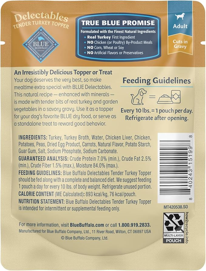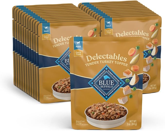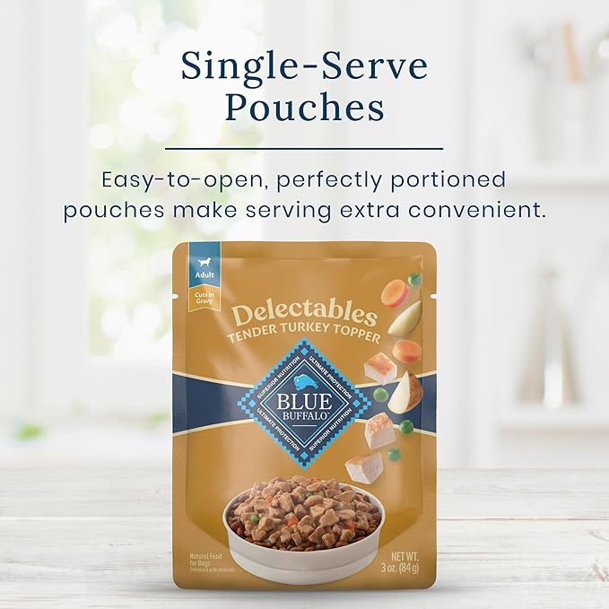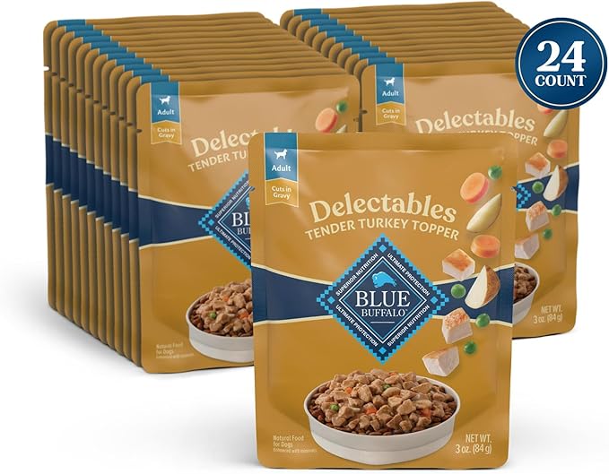• Contains twenty four (24) three oz pouch of BLUE Delectables Natural Wet Dog Food Topper, Turkey Dinner
