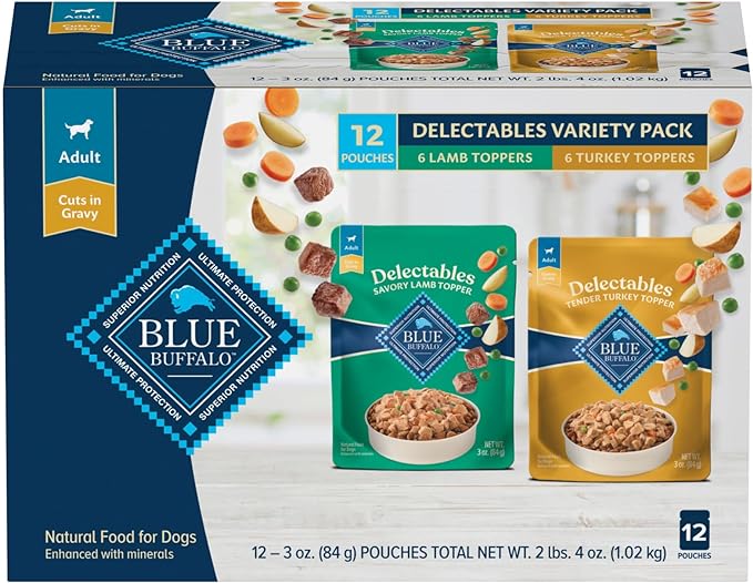 • Contains one (1) variety pack of BLUE Delectables Natural Wet Dog Food Topper, Lamb & Turkey Dinner 12 pack (3-oz - 6 of each flavor)