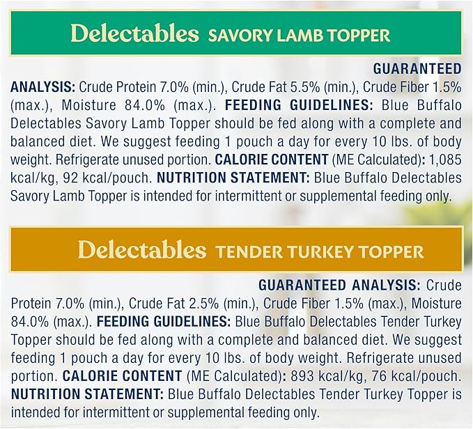 • Contains one (1) variety pack of BLUE Delectables Natural Wet Dog Food Topper, Lamb & Turkey Dinner 12 pack (3-oz - 6 of each flavor)