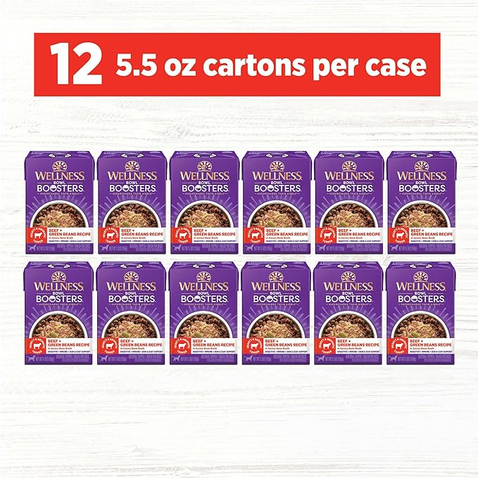 Wellness Bowl Boosters Hearty Toppers, Beef & Green Beans Recipe in Savory Bone Broth Dog Food Toppers, 5.5 Ounce Pouch (Pack of 12)