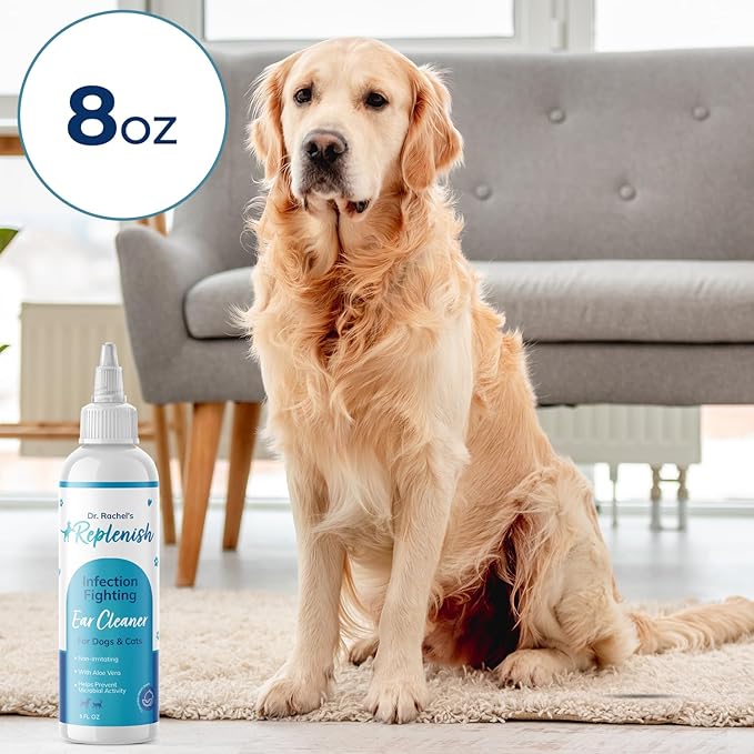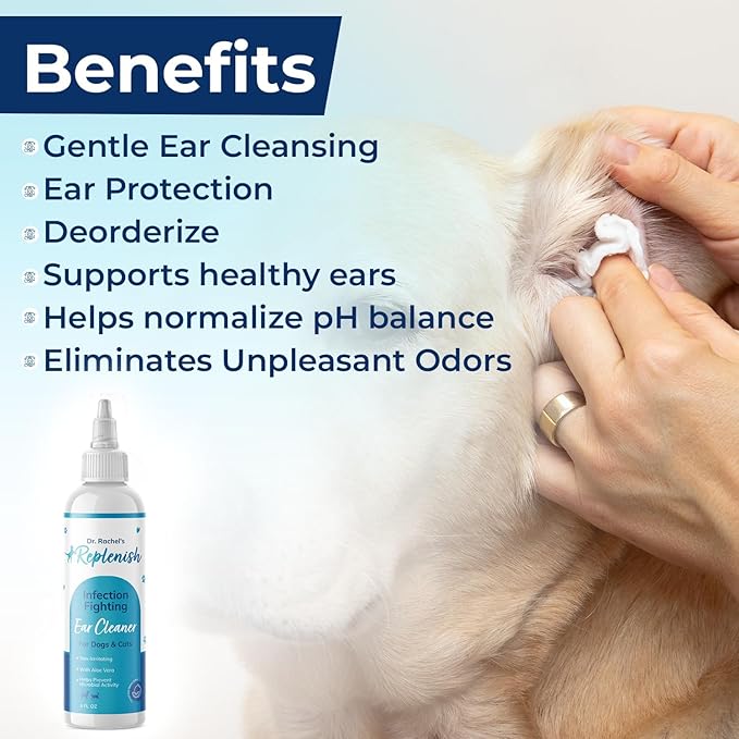 Replenish Ear Cleaner for Dogs and Cats - Dr. Rachel's Alcohol Based Gentle Ear Cleansing Solution with Aloe Vera-Infused Cucumber Melon Scent - 8 oz