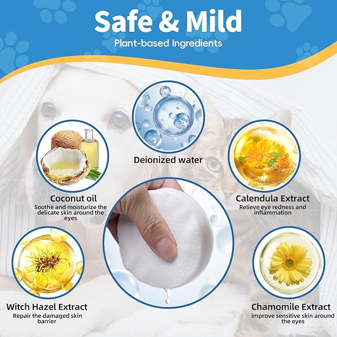 • 【Gentle Ingredients】Bycolili Cat and Dog Eye Wipes are formulated with natural extracts to create a clean and hygienic eye area for small animals, improving and preventing tear stains. The product contains coconut oil, calendula, and chamomile plant extracts to effectively clean the eyes, lighten tear stains, and soothe and moisturize the skin around the eyes.