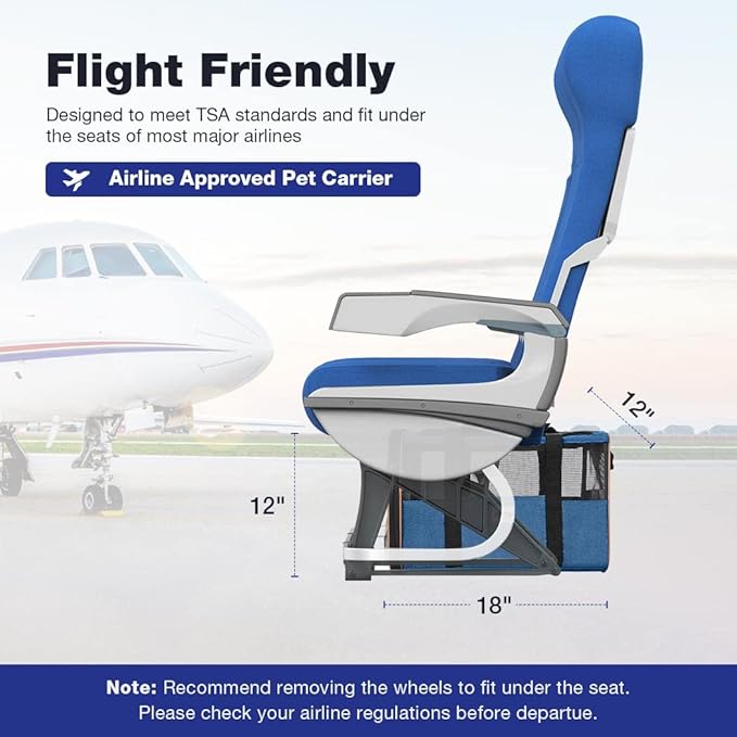 • Pet Carrier Airline Approved: Designed to meet TSA standards, this dog carrier fits under the seat of most airlines when the wheels are removed. Pet carrier size: 18''L x 12''W x 12"H (without wheels). Recommend for pets up to 20lbs.