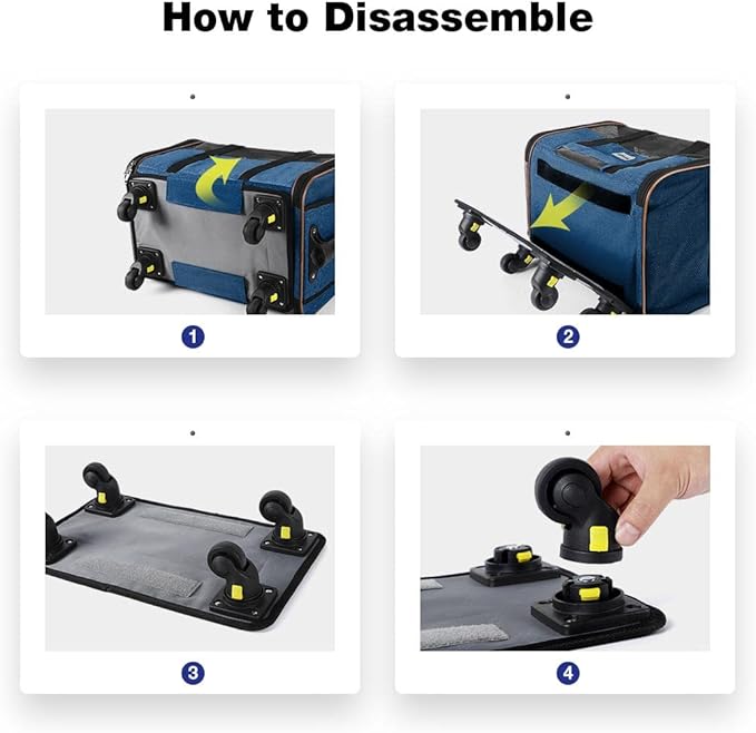 • Pet Carrier with Wheels: A removable platform with 4 wheels and a telescopic handle make it convenient for travelers walking through airports. The rolling cat carrier also features a carrying strap and adjustable shoulder strap for easy pulling and pushing. Platform is securely attached with high grade velcro while the wheels are easy to assemble or disassemble.