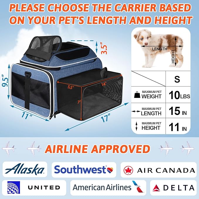 Top and Side Expandable Pet Carrier 17x11x9.5 Inches Alaska Airline Approved, Soft-Sided Carrier for Small Cats and Dogs with Locking Safety Zippers and Anti-Scratch Mesh(Blue)