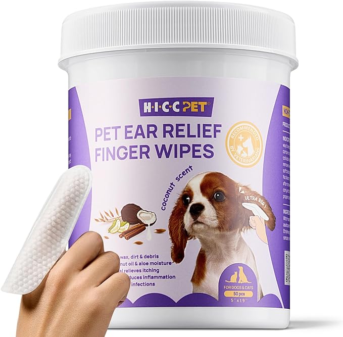 HICC PET Ear Finger Wipes for Dogs & Cats - Gently Remove Ear Wax, Debris - Sooths & Deodorizes - Relieve Ear Itching & Inflammation, Fresh Coconut Scent, All Natural Ingredients - 50 Count
