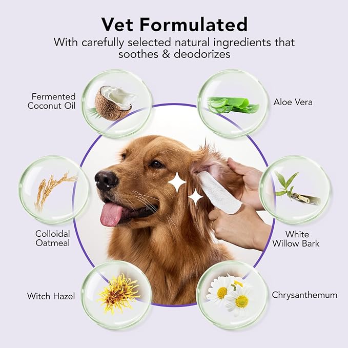 • 【All Natural Ingredients】The key natural ingredients of our dog ear cleaner wipes include: fermented coconut oil, colloidal oatmeal, witch hazel extract, white willow bark, chamomile extract, and aloe vera leaf juice. Gentle on your pets' ears, our pet ear wipes are alcohol-free and free of parabens and fragrances, ensuring a soothing and non-irritating experience. Safe if licked or ingested.