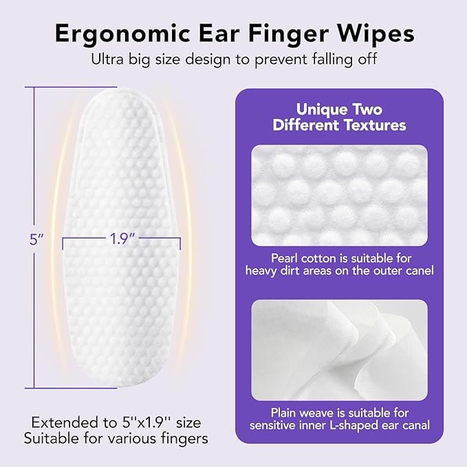 • 【Ear Finger Wipes Plus】Extended pet ear finger wipes size to 5'' x 1.9'', ensuring easier to wear on fingers and Anti-slip off. Crafted from high-quality 100% biodegradable plant fibers, our dog ear cleaning wipes are gentle and soft on the skin. Dual-sided texture caters to the varying needs of different areas of the ears; Pearl cotton is for heavy dirt on the external side of the ear, while the plain weave is ideal for the sensitive inner areas.