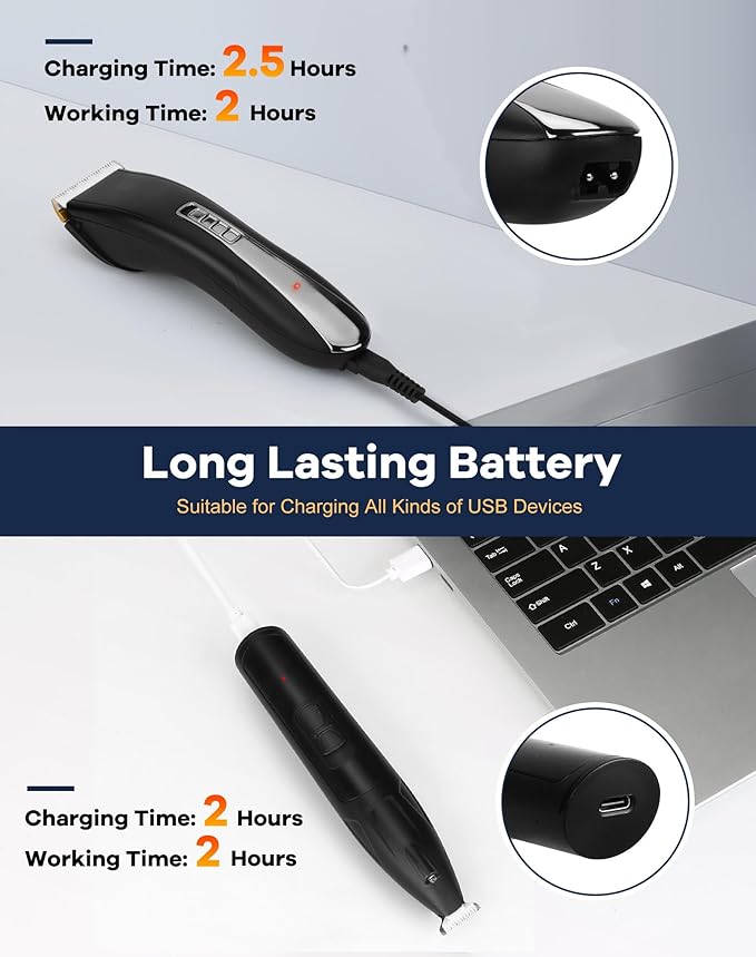• Low Noise & Rechargeable: The pet clipper's working noise is lower than 55 dB, protecting your pets from nervousness and fear during the grooming process and making home grooming easy. Built-in high-capacity rechargeable battery for extreme flexibility. The pet hair clipper works for 2 hours after 2.5 hours of charging, while the small pet paw trimmer works for 2 hours after 2 hours of charging. It can also be used while charging, so you don't have to worry about it stopping working.