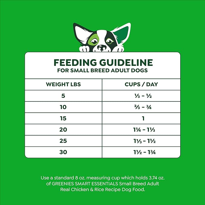 • Contains one (1) 5.5 lb. Bag of Greenies Smart Essentials Small Breed Adult High Protein Dry Dog Food Real Chicken & Rice Recipe.